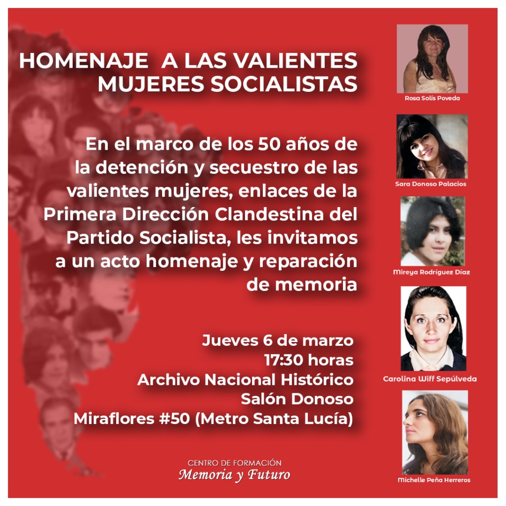 El Centro de Formación Memoria y Futuro confirmó hoy que se realizará el próximo jueves 6 de marzo un homenaje a mujeres militantes del partido Socialista de Chile que fueron detenidas y desaparecidas en 1975 por organismos de la policía política del régimen dictatorial de Augusto Pinochet (1973-90).
