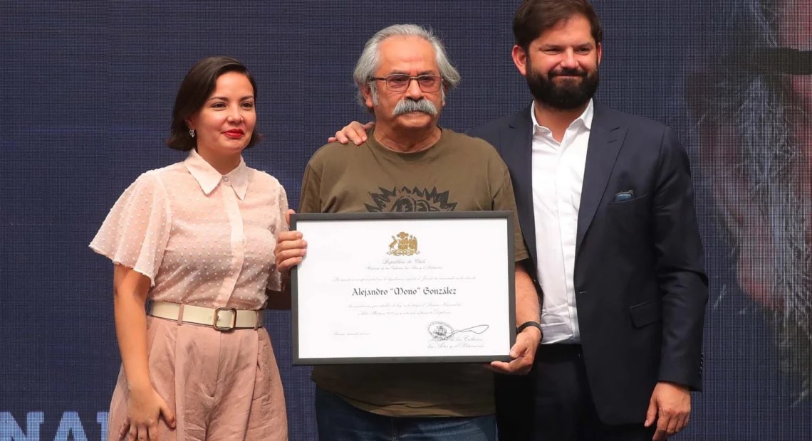 Alejandro «Mono» González, Premio Nacional de Artes Plásticas, recibe el reconocimiento este martes 30 de diciembre de manos del Presidente Gabriel Boric y de la ministra de las Culturas, Carolina Arredondo, en el Palacio de La Moneda. Foto: Ministerio de las Culturas, las Artes y el Patrimonio.