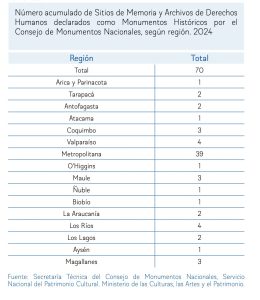 La categoría Sitios de Memoria es la que representa la mayoría de los casos dentro de los Monumentos Históricos declarados, con un total de 60 sitios. También hay presencia de Archivos de Derechos Humanos, que cumplen un rol clave en el resguardo del acervo documental, los cuales están concentrados solo en la Región Metropolitana (10 registros).